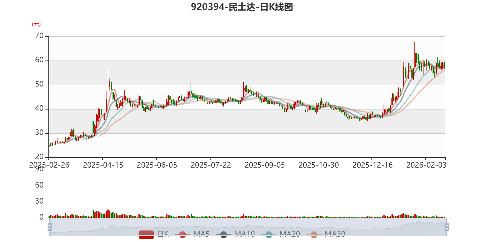 中证智能财讯民士达(920394)2月26日晚间披露2025年业绩快报,公司实现营业收入4.47亿元,同比增长9.58%;归母净利润1.28亿元,同比增长27.49%;扣非净利润1.11亿元,同比增长20.73%;基本每股收益0.88元,加权平均净资产收益率为16.44%。以2月26日收盘价计算,民士达目前市盈率(TTM)约为65.16倍,市净率(LF)约10.76倍,市销率(TTM)约17.79倍。